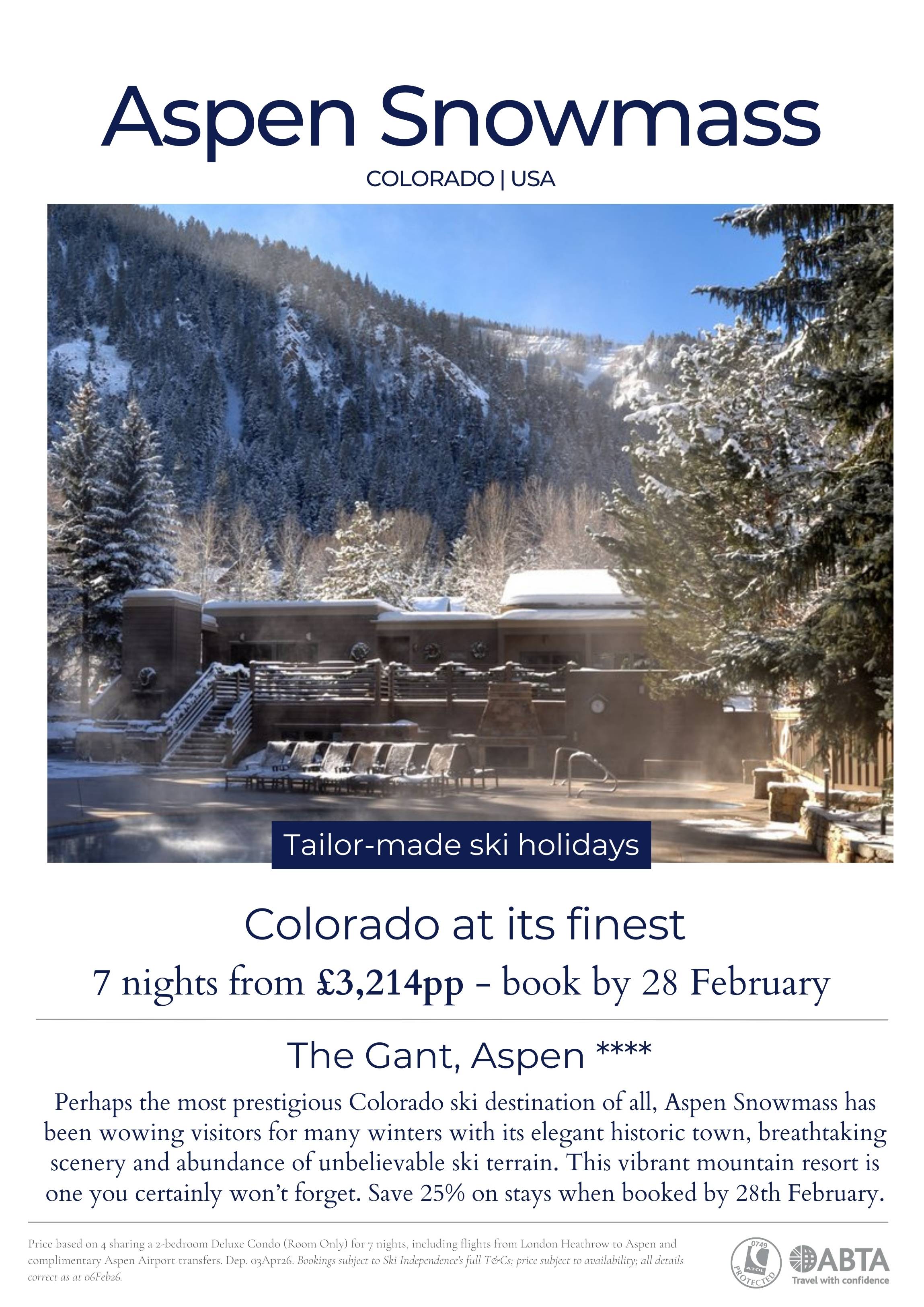 Aspen Snowmass is perhaps the most prestigious Colorado ski destination of all. The Gant is situated in a superb location a few blocks from the Silver Queen Gondola at the base of Ajax Mountain. There are outdoor heated pools and hot tubs and the legendary Gant shuttle service (The Gant Man) is on hand to ferry you around Aspen to enjoy all the shops, bars and restaurants.