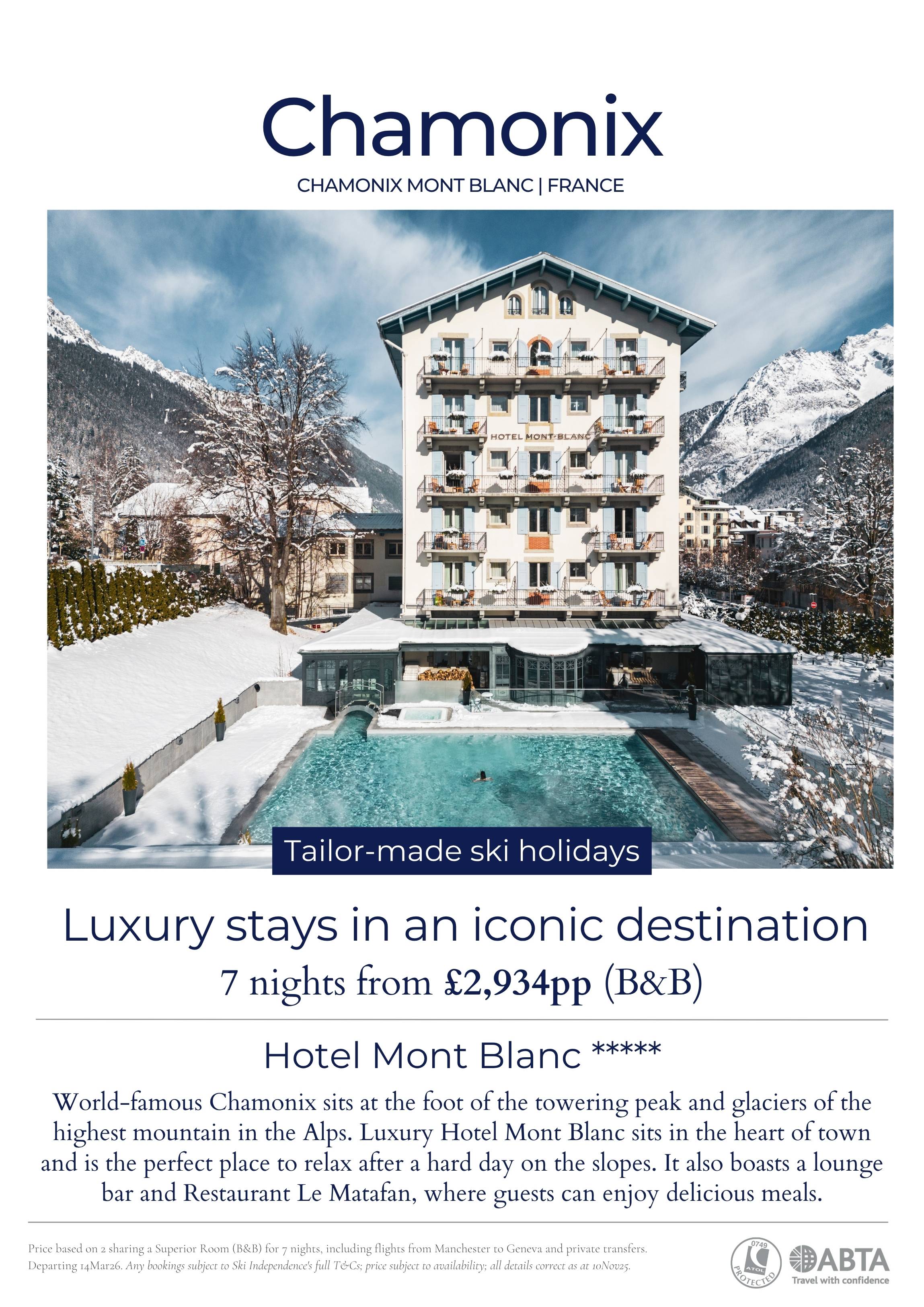 Hotel Mont Blanc sits in the heart of Chamonix and is the perfect place to relax after a hard day on the slopes. The hotel provides excellent facilities, including a spa area with outdoor heated swimming pool and Jacuzzi with stunning mountain views. Hotel Mont Blanc also boasts a lounge bar and restaurant, where guests can enjoy delicious meals.