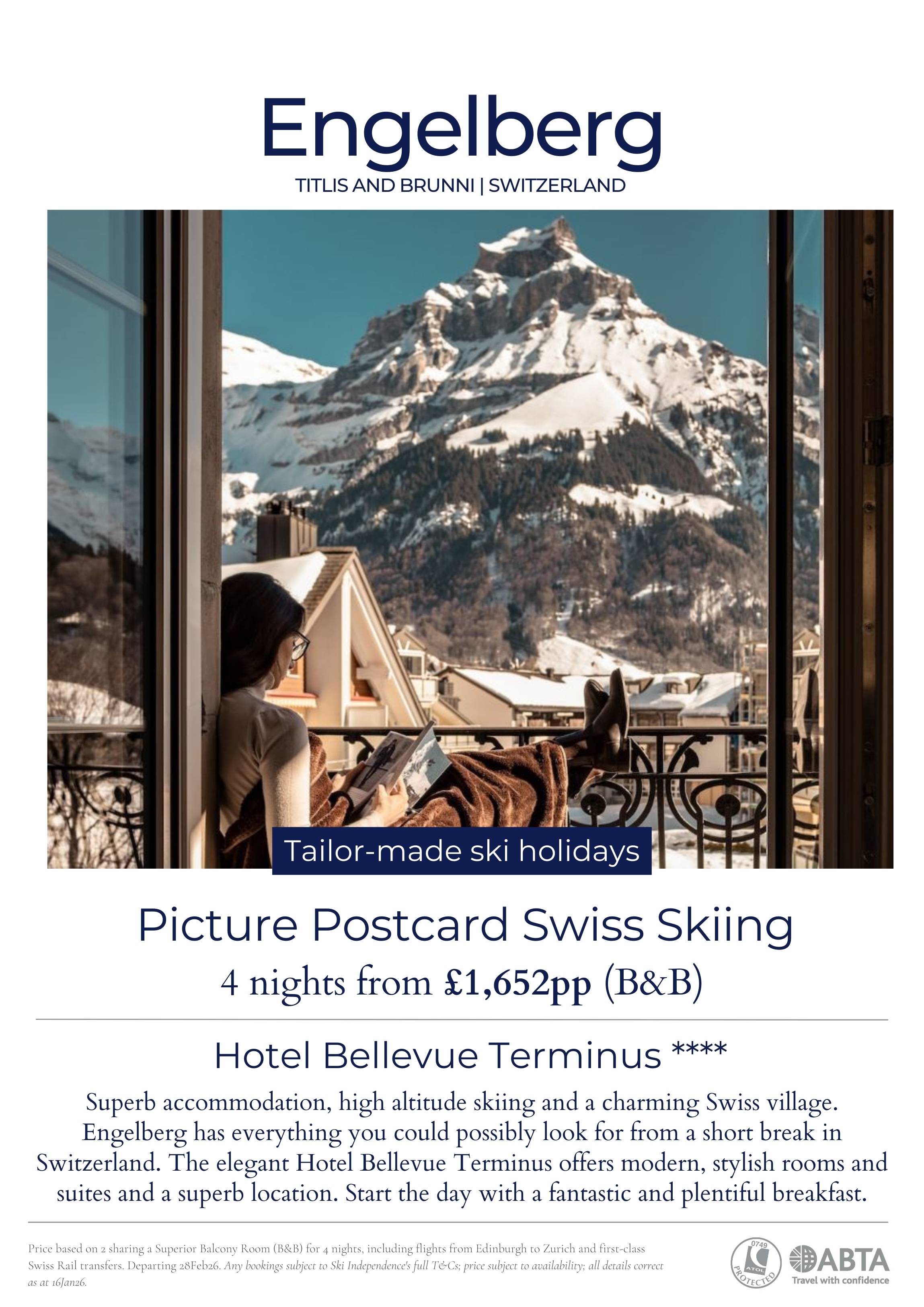 Superb accommodation, high altitude skiing and a charming Swiss village. Engelberg has everything you could possibly look for from a short break in Switzerland. The elegant Hotel Bellevue Terminus is a grand Belle Époque building with plenty of modern touches. It offers modern, stylish rooms and suites and a superb location.