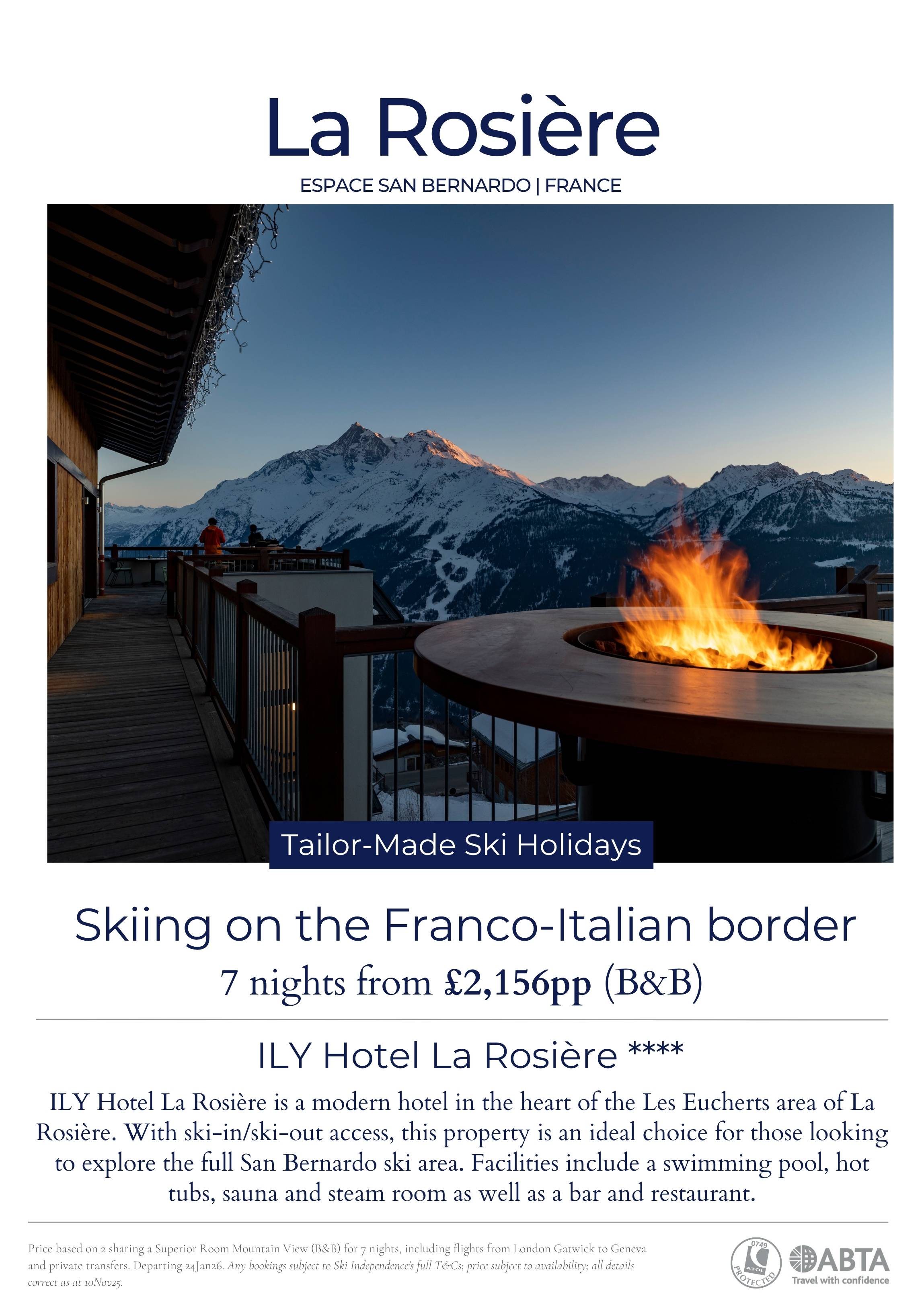 ILY Hotel La Rosiere is a modern hotel in the heart of the Les Eucherts area of La Rosiere. With ski-in/ski-out access, this property is an ideal choice for those looking to explore the full San Bernardo ski area. Facilities include a swimming pool, hot tubs, sauna and steam room as well as a bar and restaurant.