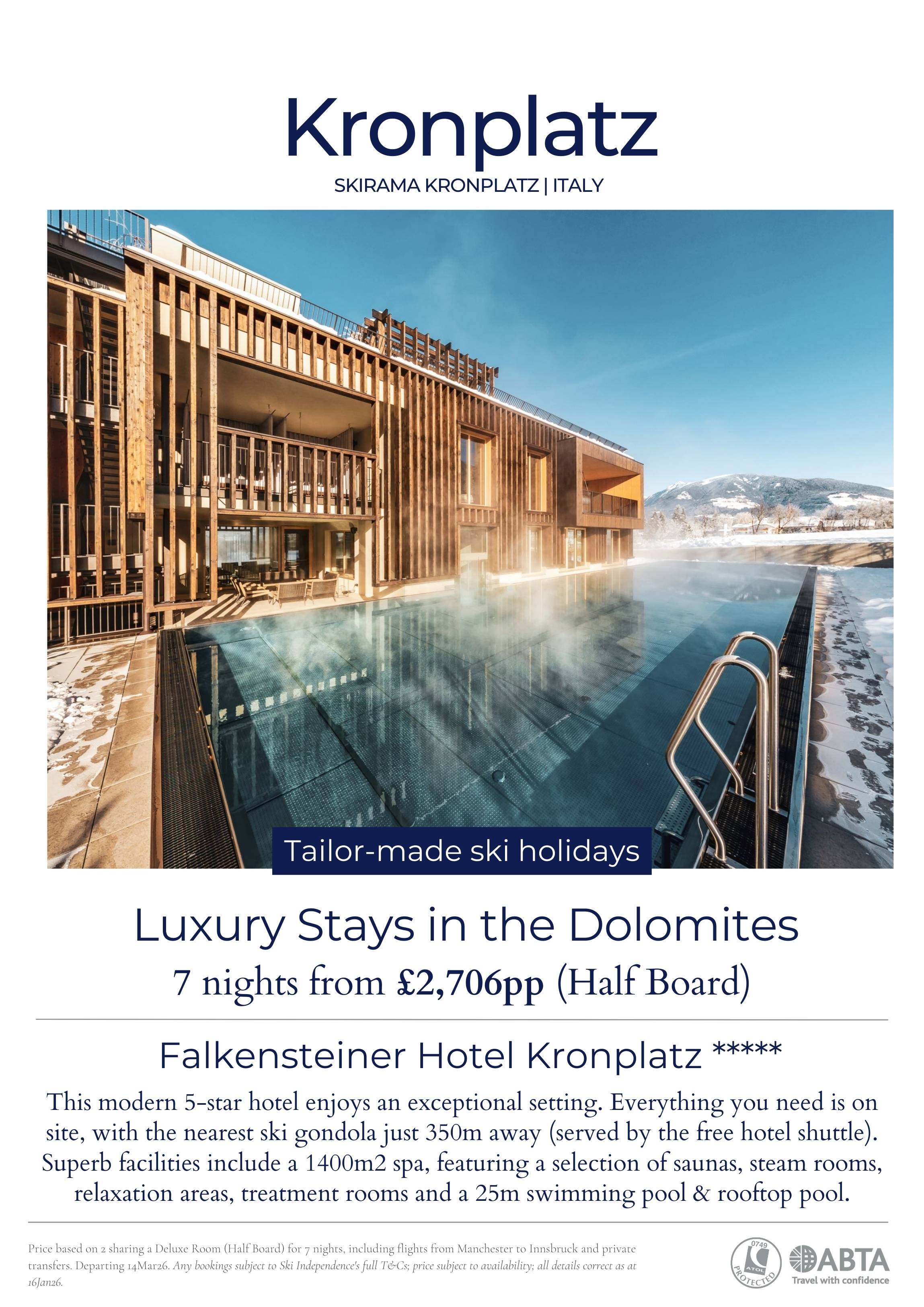 The modern 5-star Falkensteiner Hotel Kronplatz enjoys an exceptional setting. Everything you need is on site, with the nearest ski gondola just 350m away (served by the free hotel shuttle). Superb facilities include a 1400m2 spa, featuring a selection of saunas, steam rooms, relaxation areas, treatment rooms and a 25m swimming pool & rooftop pool.
