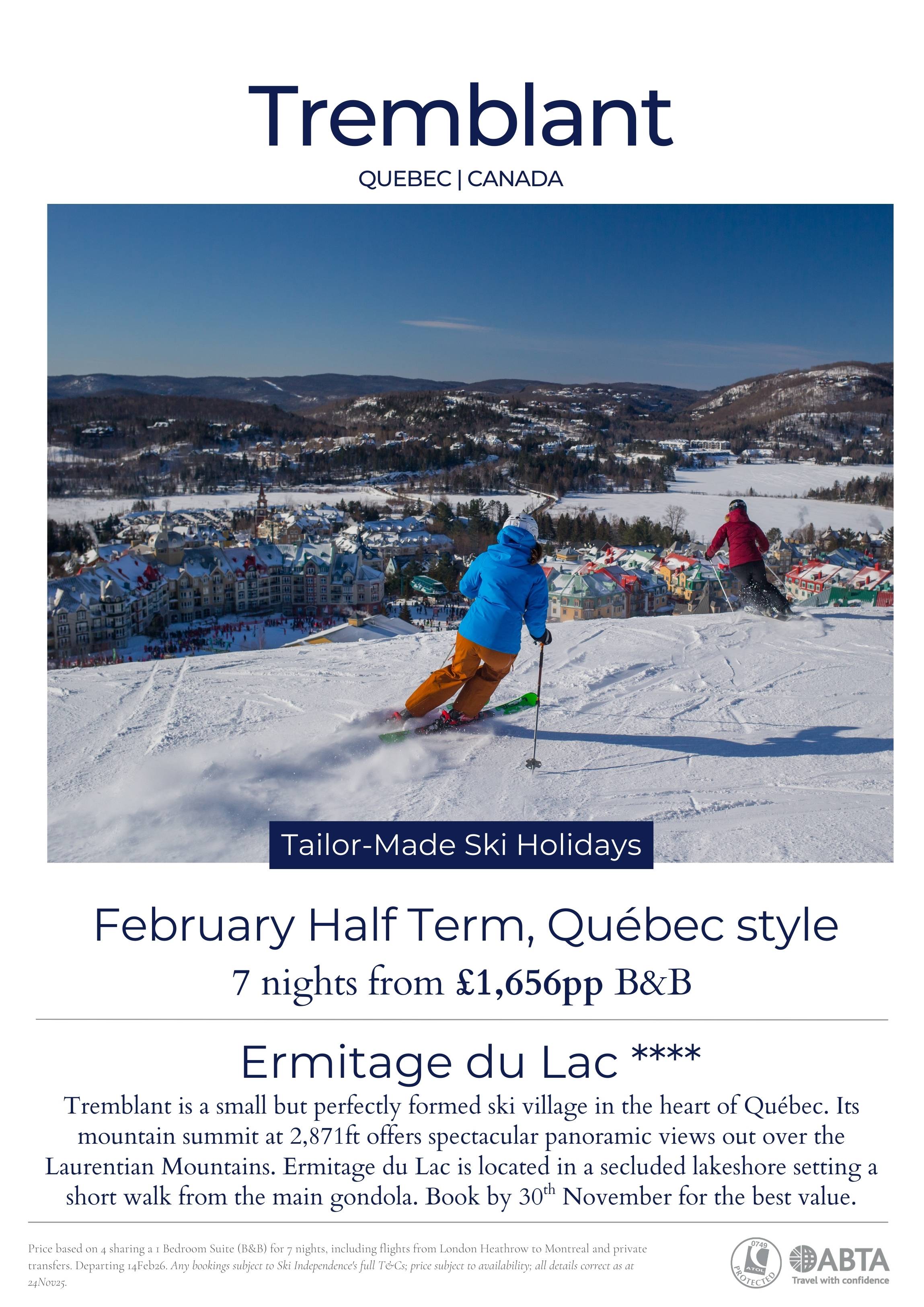 Tremblant is a small but perfectly formed ski village in the heart of Québec. Its mountain summit at 2,871ft offers spectacular panoramic views out over the Laurentian Mountains. Ermitage du Lac is located in a secluded lakeshore setting a short walk from the main gondola.