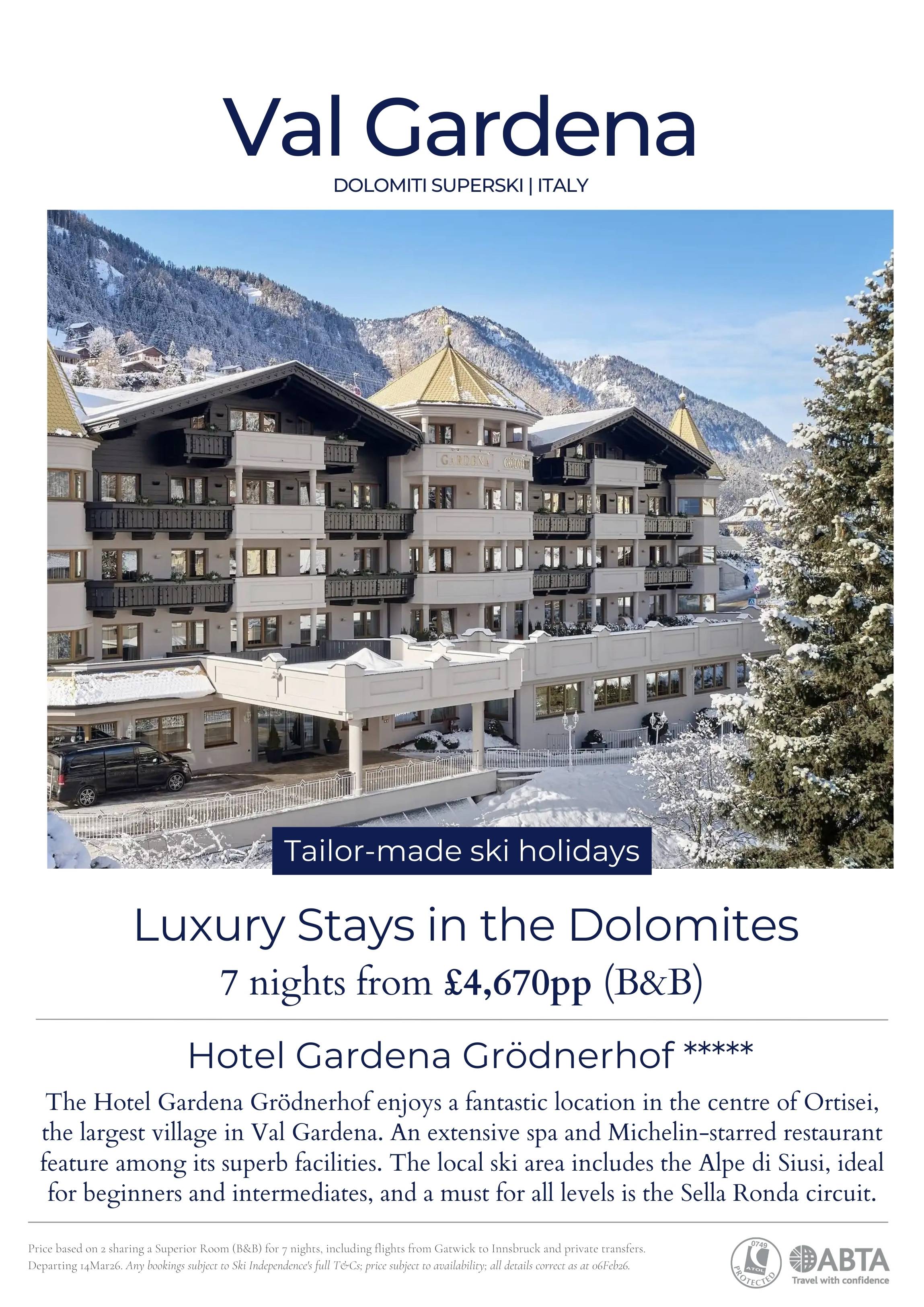 The Hotel Gardena Grödnerhof enjoys a fantastic location in the centre of Ortisei, the largest village in Val Gardena. An extensive spa and Michelin-starred restaurant feature among its superb facilities. The local ski area includes the Alpe di Siusi, ideal for beginners and intermediates, and a must for all levels is the Sella Ronda circuit.
