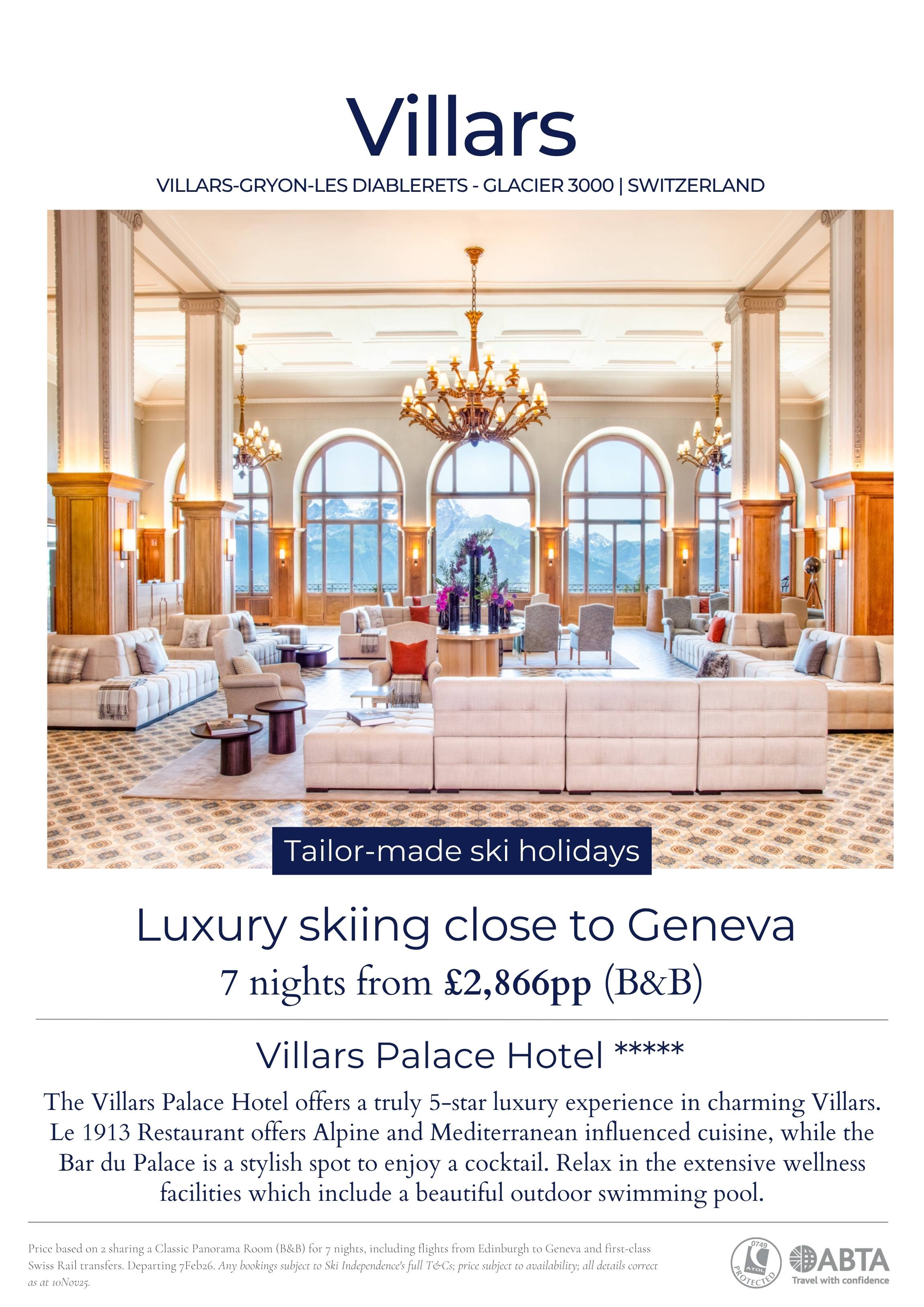 The Villars Palace has recently undergone a complete renovation. Located in the centre of the resort close to the station, the nearest uplift is just 5 minutes away on foot or a quick journey away using the hotel`s shuttle service. Le 1913 Restaurant offers Alpine and Mediterranean influenced cuisine while the Bar du Palace is a stylish spot to enjoy a signature cocktail. Relax in the extensive wellness facilities which include a steam room, sauna, and relaxation area as well as a beautiful outdoor swimming pool.