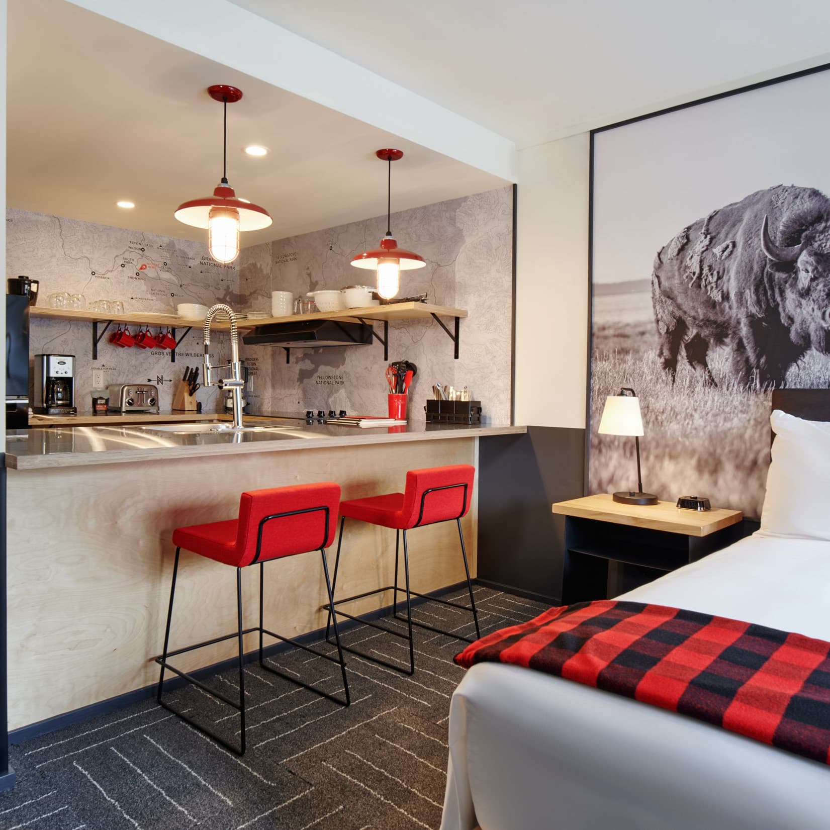 Located in the heart of Jackson Hole, Mountain Modern is a funky, well designed property just steps from the historic town centre. The contemporary guest rooms have a simple open-plan layout with loads of practical storage for your ski and snowboard gear while the apartment style suites offer seperate sleeping and living spaces with full kitchens.