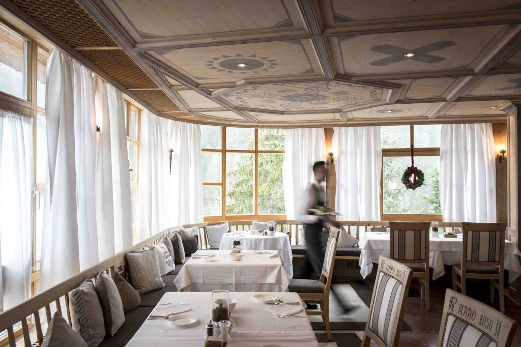 The Alpine huts along the ski slopes of the Gardena Valley serve local fare mixing traditional Italian with South Tyrolean dishes; against the magnificent background of the snow-capped peaks of the Sella Mountain Group in the Dolomites.